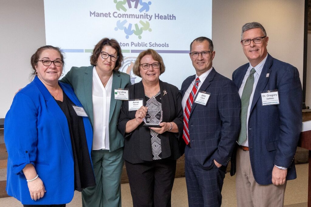 Anne Bisson, Manet Community Health Board Member and former longtime Director of the Department of Human Services and Council on Aging for the City of Taunton (center holding award) is honored for her instrumental role in connecting Manet and TPS. With her are (from l to r) Grace Murphy-McAuliffe, President of the Manet Board of Directors, Cynthia Sierra, Manet CEO, John Cabral, TPS Superintendent, and Dr. Gregory DeMelo, Chair of the Taunton school Committee.